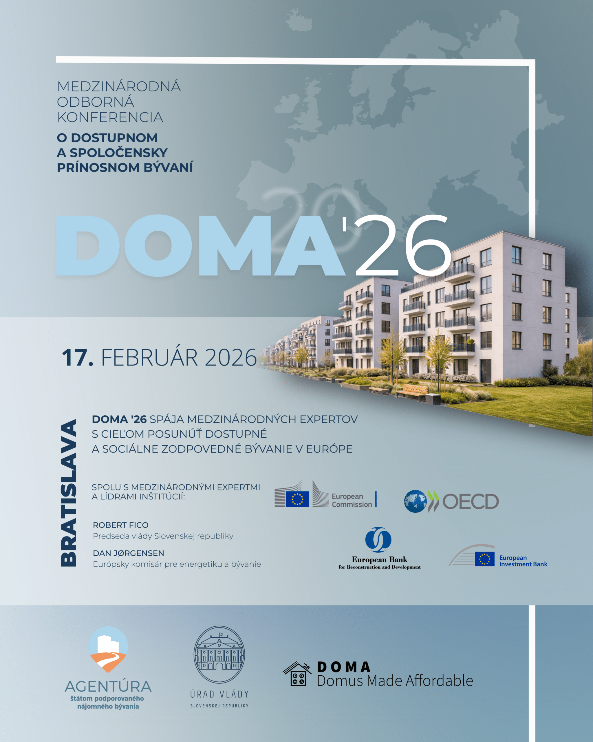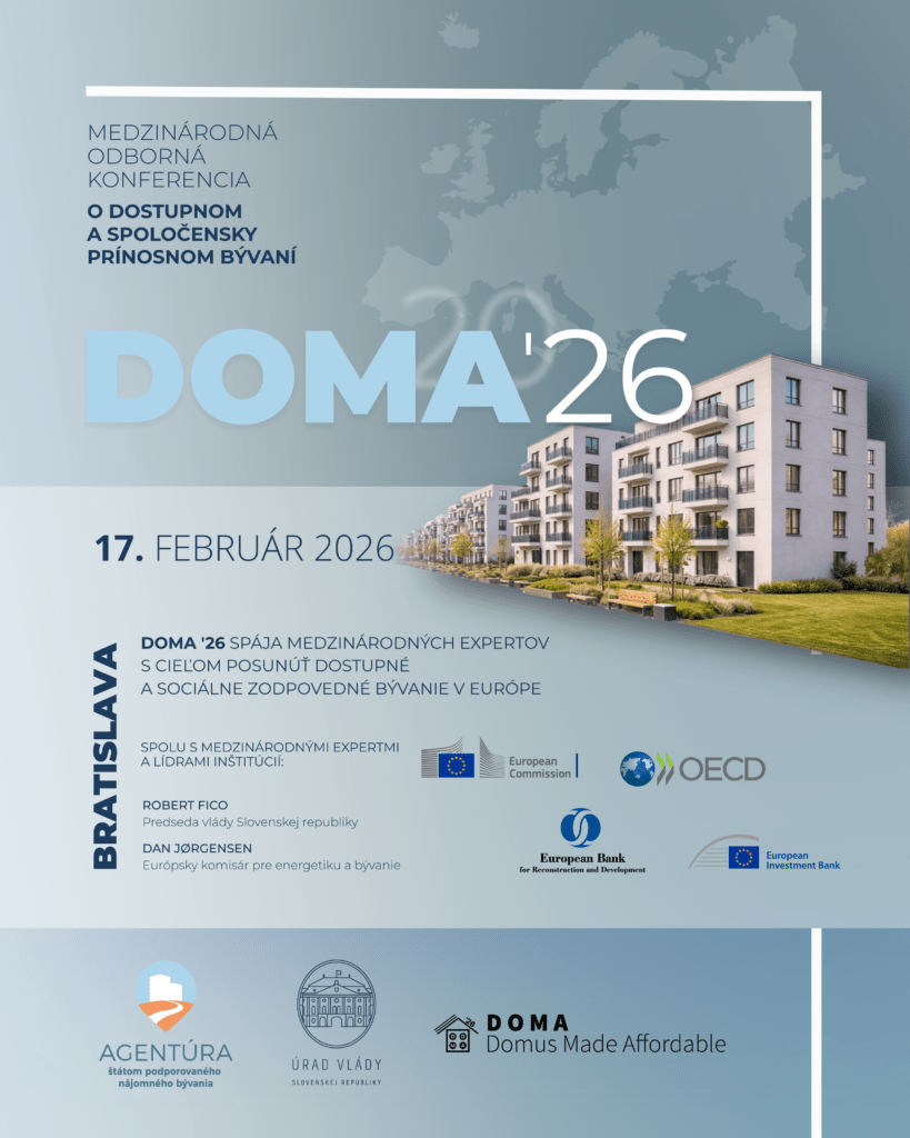 Dostupnosť bývania patrí medzi najväčšie výzvy Európy. Podujatie DOMA´26 vytvára priestor pre strategickú diskusiu o dostupnom a spoločensky prínosnom bývaní v Európe. Spája predstaviteľov vlád, európskych inštitúcií, miest, investorov a odborníkov s cieľom posunúť bývanie od politickej témy k funkčnému systému s reálnymi výsledkami. Slovensko sa stáva aktívnym hráčom európskej debaty – s dátami, modelmi a konkrétnymi riešeniami pripravenými na realizáciu.