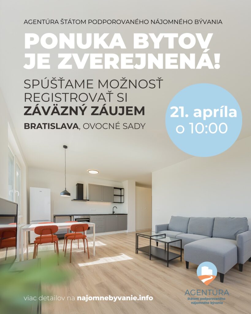 Záujemcovia o nájomné bývanie v Bratislave si od 21. 4. 2026 od 10:00 hod. môžu registrovať záväzný záujem o byty v druhej časti projektu Ovocné sady v Bratislave.